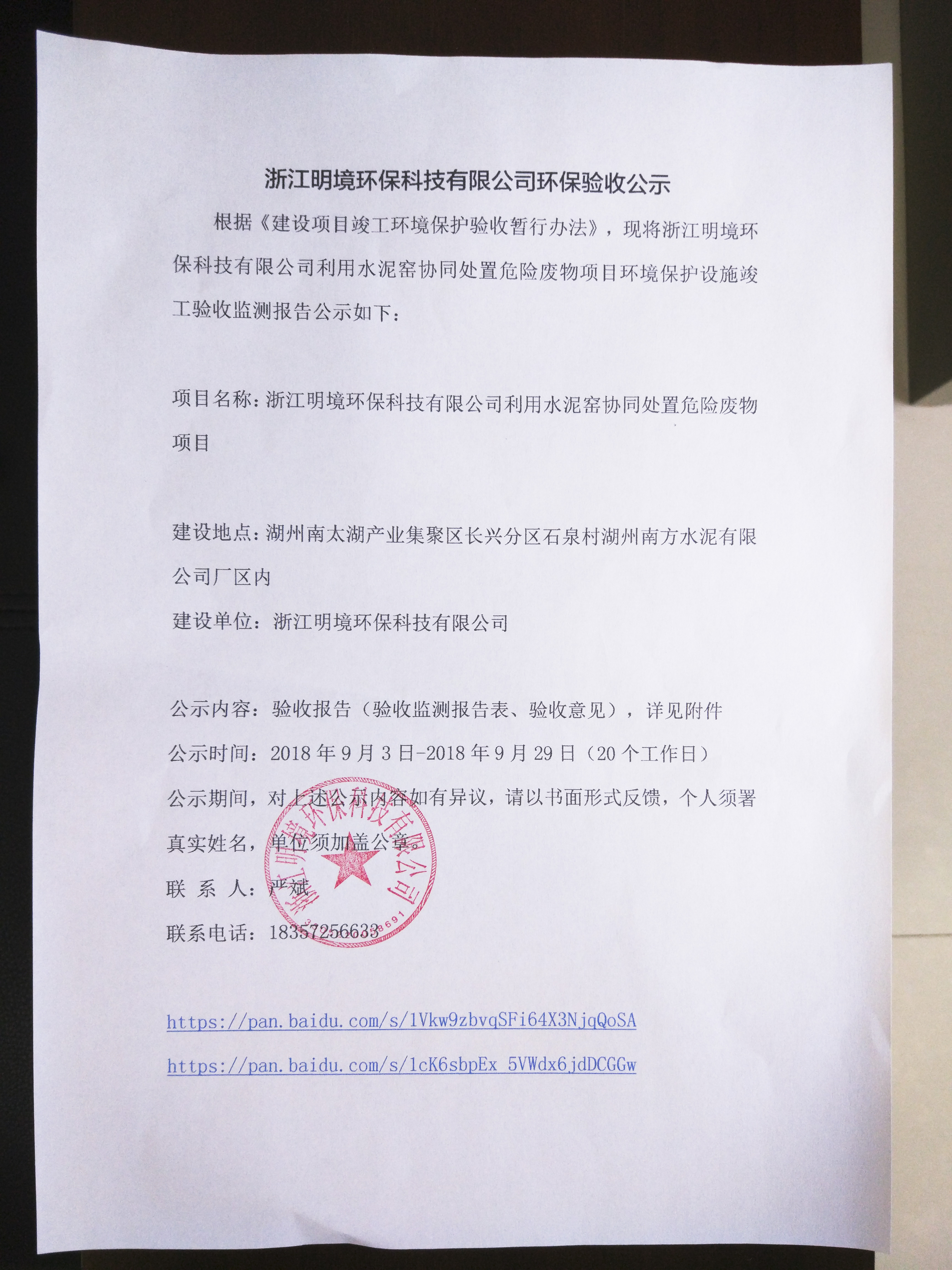 根據(jù)《建設(shè)項目竣工環(huán)境保護(hù)驗收暫行辦法》,現(xiàn)將浙江明境環(huán)保科技有限公司利用水泥窯協(xié)同處置危險廢物項目環(huán)境保護(hù)設(shè)施竣工驗收監(jiān)測報告公示如下: