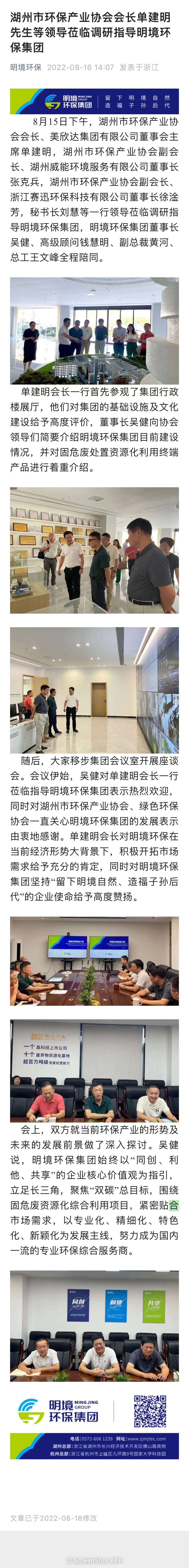 湖州市環(huán)保產(chǎn)業(yè)協(xié)會會長單建明一行 蒞臨指導(dǎo)明境環(huán)保集團